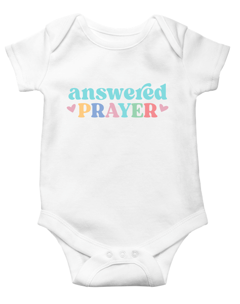 Celebrate the wonder of new life with our Inspirational Baby Onesie collection. Adorned with heartfelt messages like "Wonderfully Made", “Jesus Loves Me” and "Answered Prayer", these onesies are a perfect reminder of the miracle of your little one. Available in sizes 3-6 months, they make the perfect gift for any new parent.