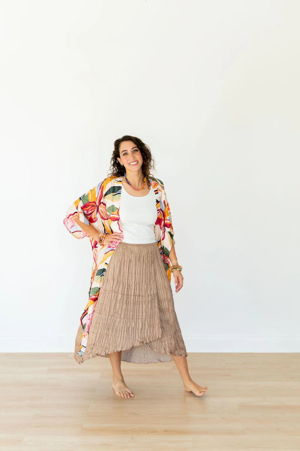 The WW long kimono is timeless fusion of elegance and comfort. Crafted from luxurious lightweight 100% Modal Satin, this kimono drapes effortlessly, offering a graceful silhouette that flatters every figure. Whether lounging at home, running errands or going out for the evening, this piece will effortlessly elevate your wardrobe. Wear as is or experiment with wrapping and tying for a variety of looks, our long kimono is a versatile addition to any wardrobe. Elevate your style and embrace effortless glamour with this must-have wardrobe essential.