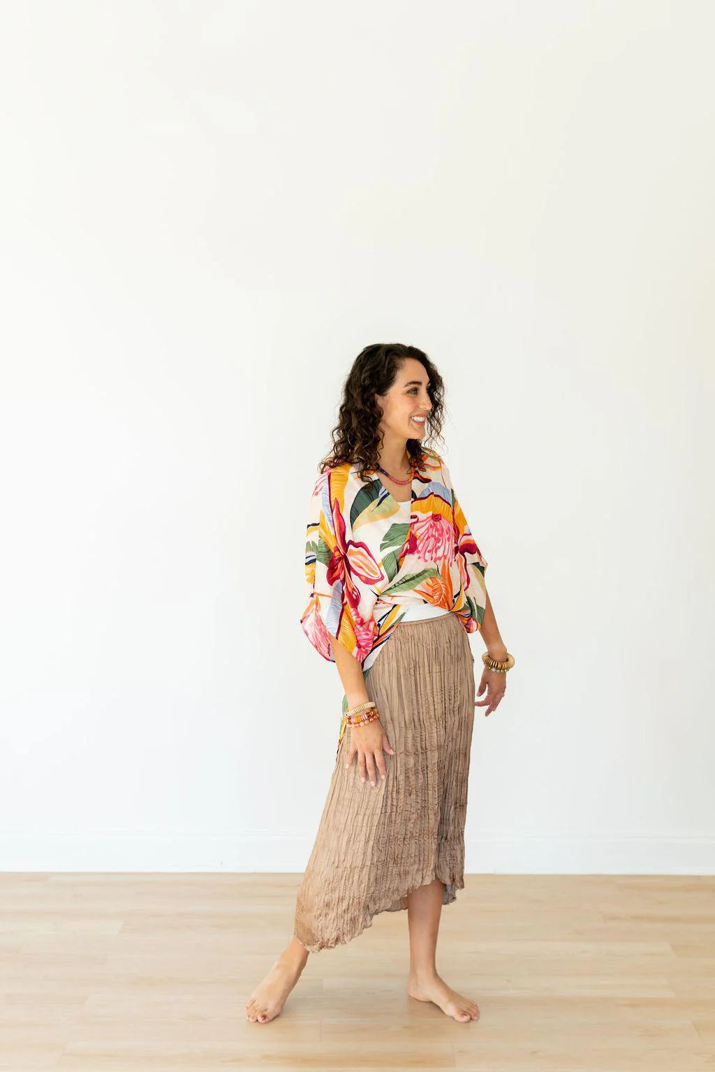 The gorgeous West Palm print is perfect for year-round wear. With soft tropical flowers and leaves on a cream background, this print can add style to any look. Made of soft and flowing fabrics, this print is sure to be your new favorite!