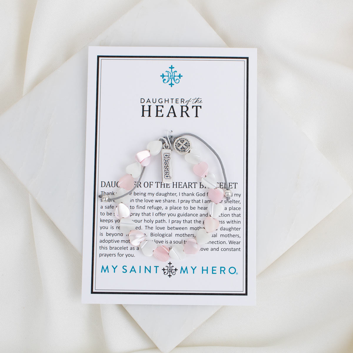 - Mother-of-pearl pink and white heart beads, silver-tone St. Benedict Medal, and "blessed" charm tag