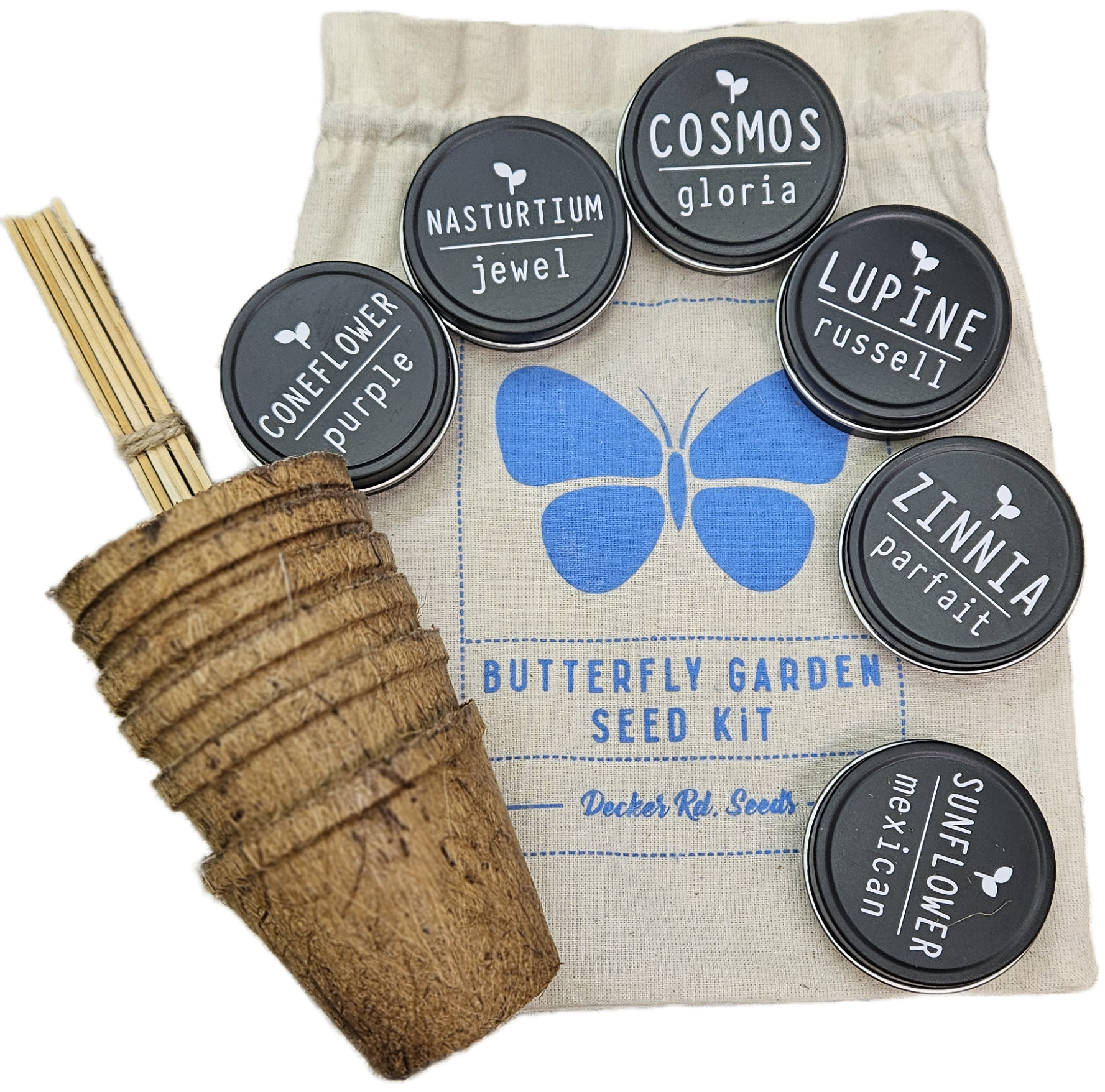 Butterfly Garden Seed Kit, which includes everything you'll need to start your own garden with flowers designed to attract butterflies. Kit includes: 6 coco fiber pots, 6 soil pellets, 6 wooden plant markers, and 6 seed tins filled with flower seeds. Packaged in 7"x9" unbleached cotton bag, with hemp drawstring. Flower varieties include: Zinnia 'Parfait' - a pretty mix of a variety of pink, purple, yellow, orange, and white zinnias Nasturtium Mix - lovely mix of bright orange and yellow trailing nasturtiums. Super easy to grow, and blooms all summer. Coneflower 'Pale Purple' - 3 ft. tall and sturdy, with a very pale purple color. Very large seed head that birds and butterflies love. Cosmos 'Gloria' - tall, carefree, and low-maintenance. Dark pink petals with an even darker center. Blooms all summer into Fall. Lupine 'Russell Mix' - colorful mix of purple, yellow, pink, and blush lupines. Blooms spring into early summer. Mexican Sunflower - fiery orange daisy-like flowers with gold centers. Blooms late summer through fall.