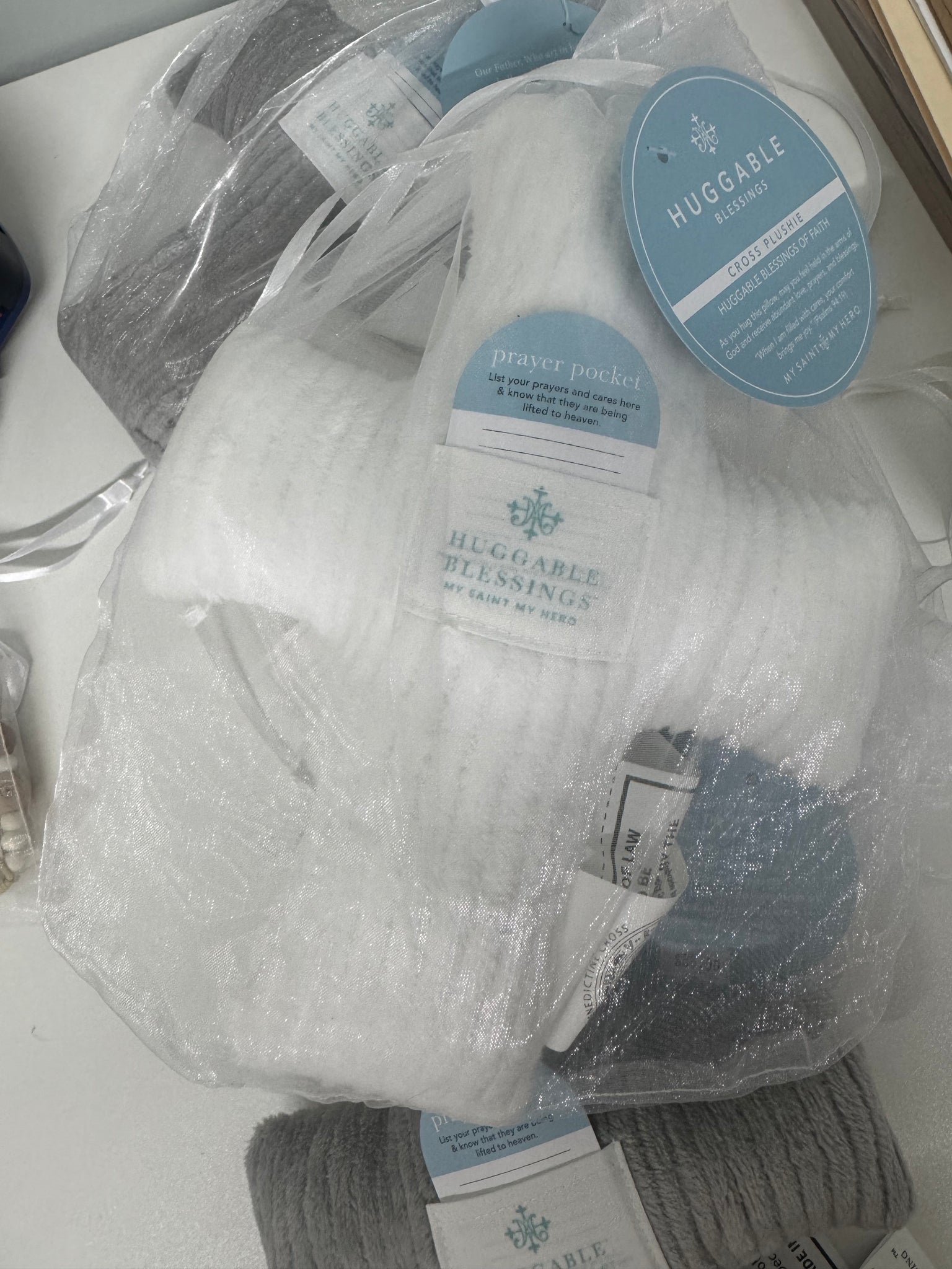 - Soft, plush weighted pillow with prayer pocket and customizable prayer card, and an organza gift bag