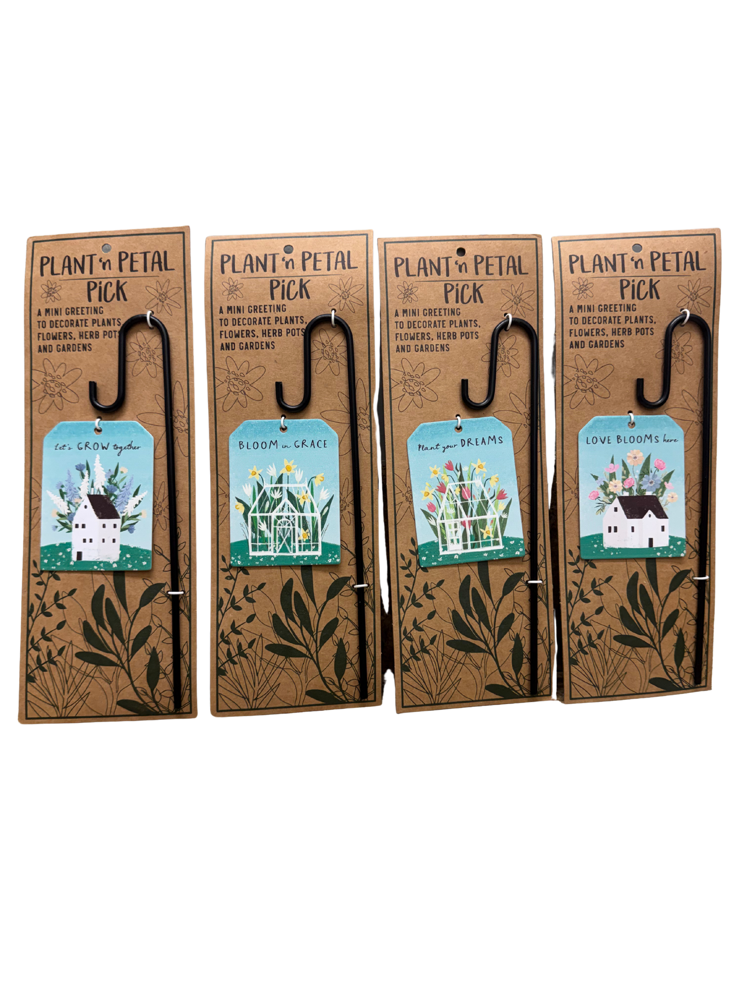 This 8-inch black metal Shepherd’s Hook includes a hanging multicolored metal card measuring 2.25" by 3", featuring inspirational sayings like “Let’s Grow Together,” “Bloom in Grace,” “Plant Your Dreams,” and “Love Blooms Here.” Designed to elegantly decorate plants, flowers, herb pots, or garden spaces, it adds a meaningful touch to plant gifts, baskets, or standalone displays, combining decorative appeal with thoughtful messages that enhance any green space.